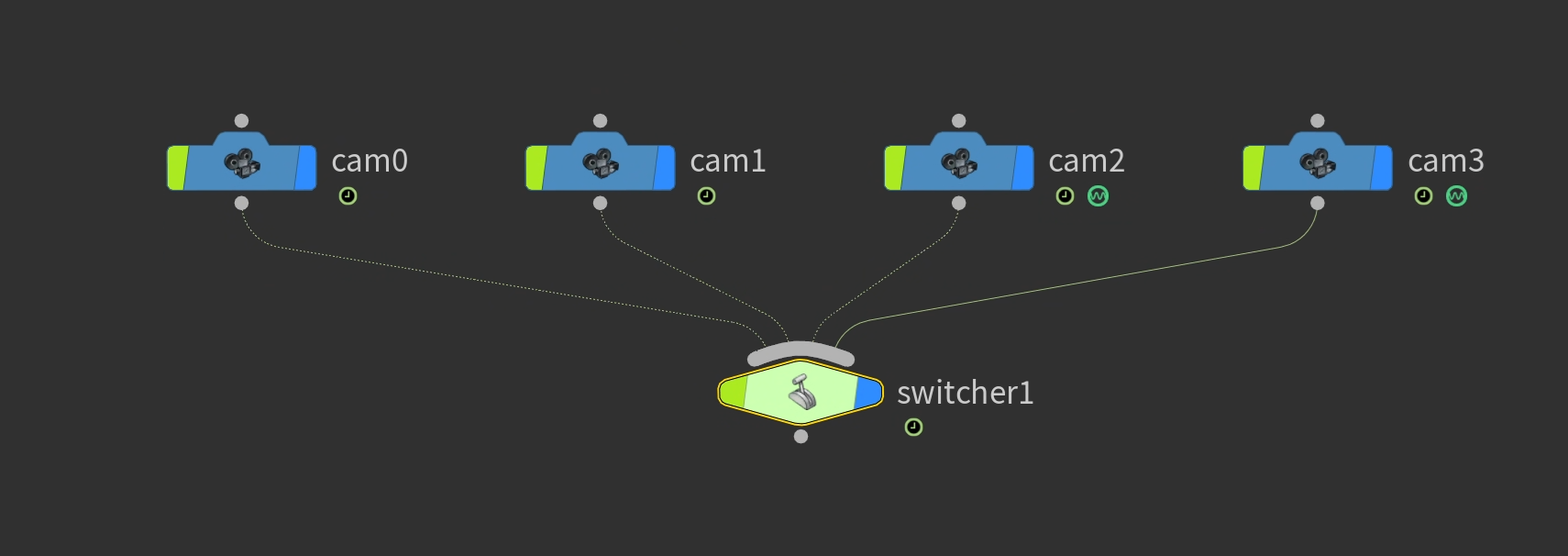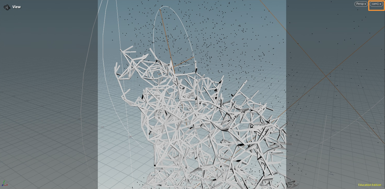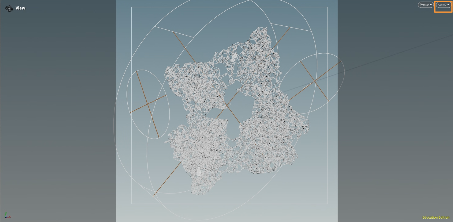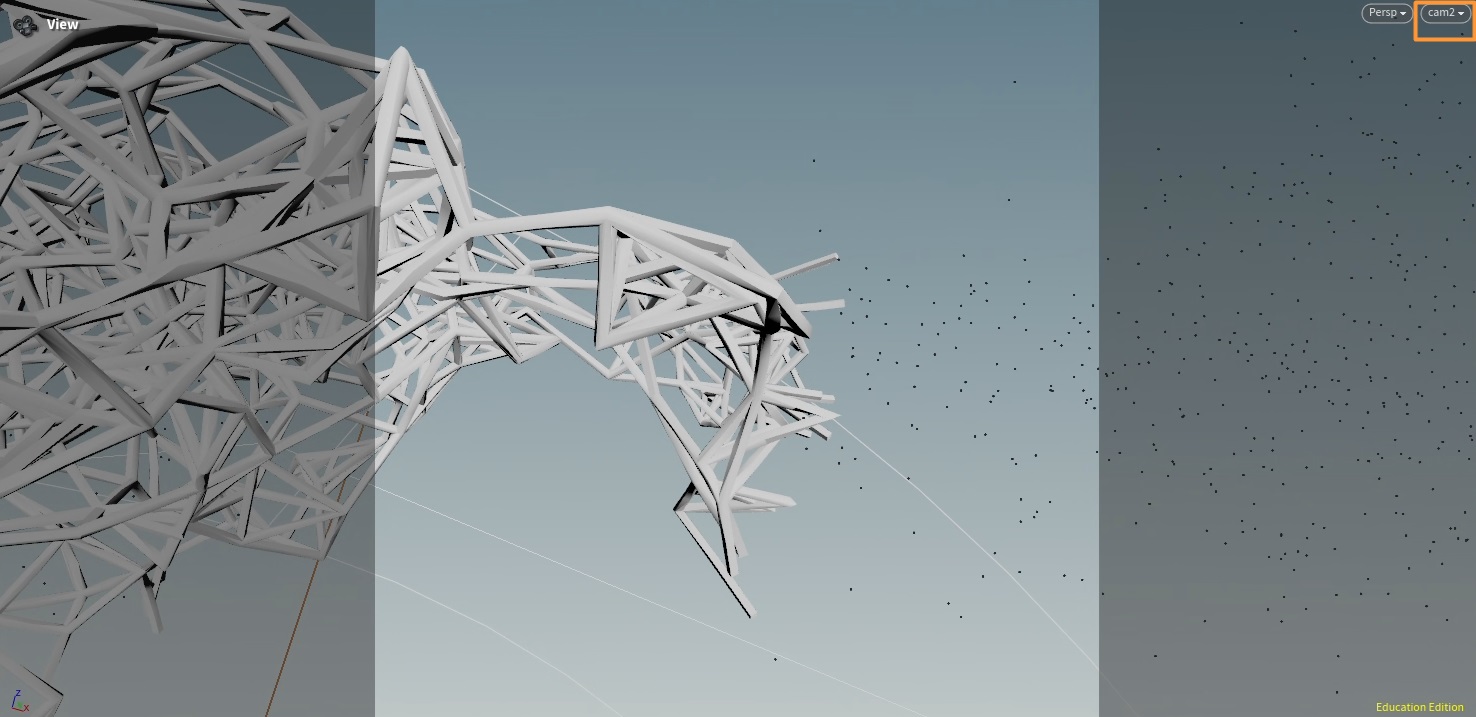 The animation utilizes four distinct camera moves, controlled sequentially through a Switch node. The first camera animates linearly along the Z-axis to approach the emerging structure. The second camera follows the development of the structure, rotating around 35 degrees along the Y-axis for a different perspective. The third camera focuses on the ends of the torus, using a CHOP network and Look-at Constraint to keep the structure in focus. Finally, the fourth camera moves along the Y-axis, slowly, from a distance, revealing the structure's ends connecting, allowing the viewer a moment to take in the full scale of the scene.