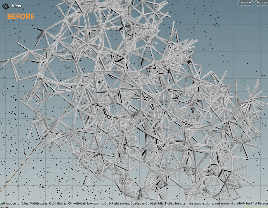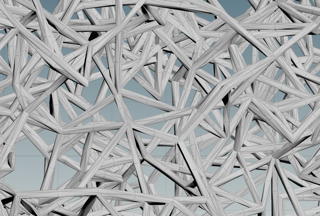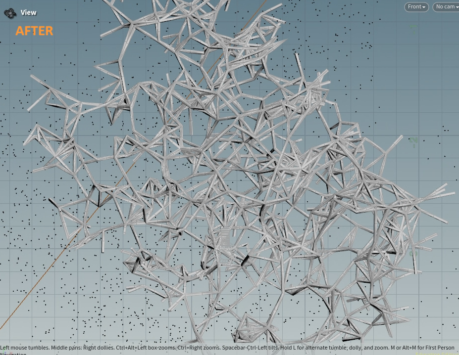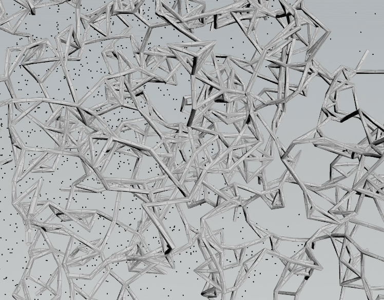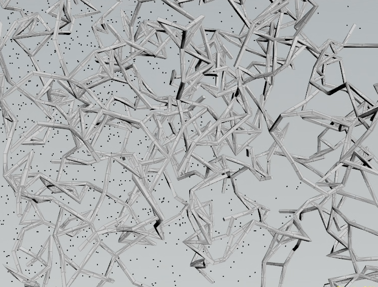 To resolve this, I applied three approaches: narrowing the base geometry to reduce point density in these regions, optimizing the minimum distance between connected points, and increasing the refraction limit in the render settings. These adjustments resulted in clearer, more defined connections, reducing clutter and enhancing the overall clarity of the structure.