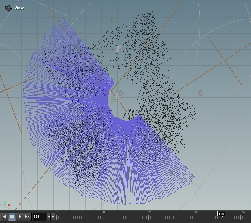 To create the gradual appearance of these lines, I generated a mask from an arc, to which I applied to the PolyWire, and I animated its Wire Radius to achieve a growing effect from frame 0 to the last frame. Additionally, I set keyframes on the Arc Angles to ensure the structure starts growing from frame 0 and reaches its endpoints by the last frame. Then I used Noise to add volume and irregularity. The mask attribute was then transferred to the main geometry stream. Through VEX code, I implemented a condition if (f@mask > 0.1), ensuring that only points with a mask value above 0.1 (a threshold I found effective) were processed, leaving unaffected points excluded from the operation.