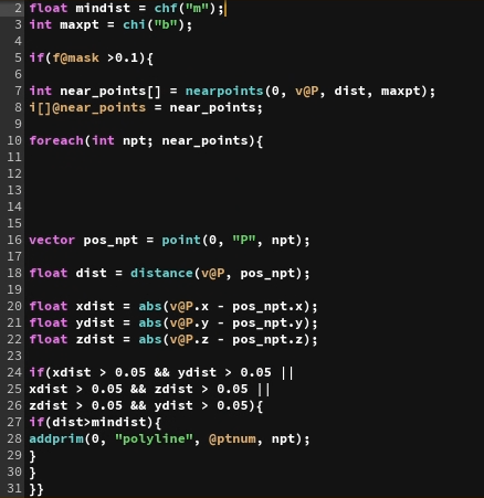The VEX code generates a dynamic, web-like structure by selectively connecting points based on proximity and spatial filtering. First, it checks if a point's f@mask value is greater than 0.1, ensuring that only specific regions of the geometry are affected. The nearpoints function identifies nearby points within a defined distance (dist), and the number of neighbors is limited by a user-defined parameter (maxpt). For each nearby point, the code calculates both the total distance and the absolute differences along the x, y, and z axes. Connections are filtered to prevent excessively close alignments along any two axes and are only made if the total distance exceeds a minimum threshold (mindist). If all conditions are met, a polyline is created between the points, forming a structured, procedural network of connections.