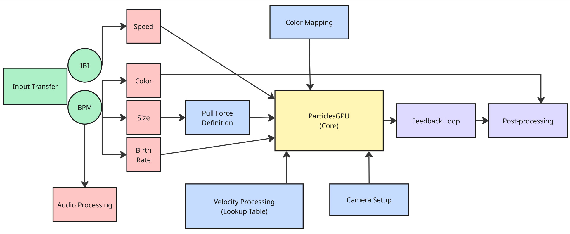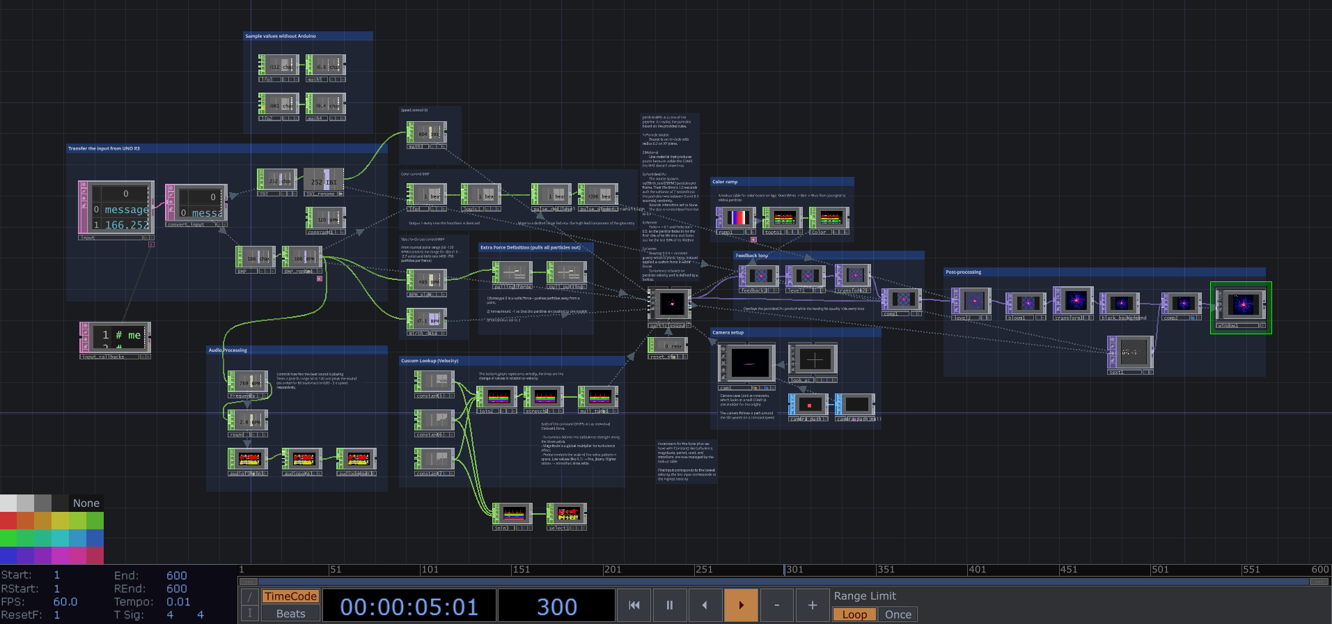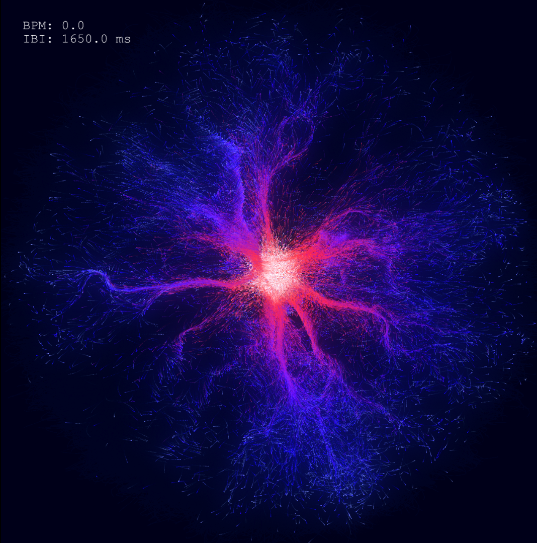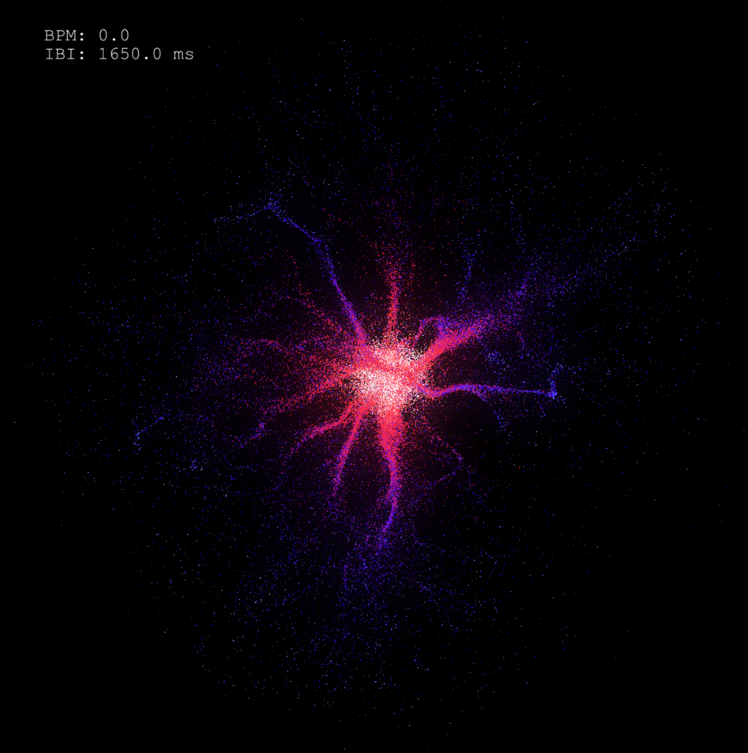 In TouchDesigner, the ParticleGPU node drives the visuals. It spawns particles, applies forces, and maps heartbeat data onto movement, color, and audio.