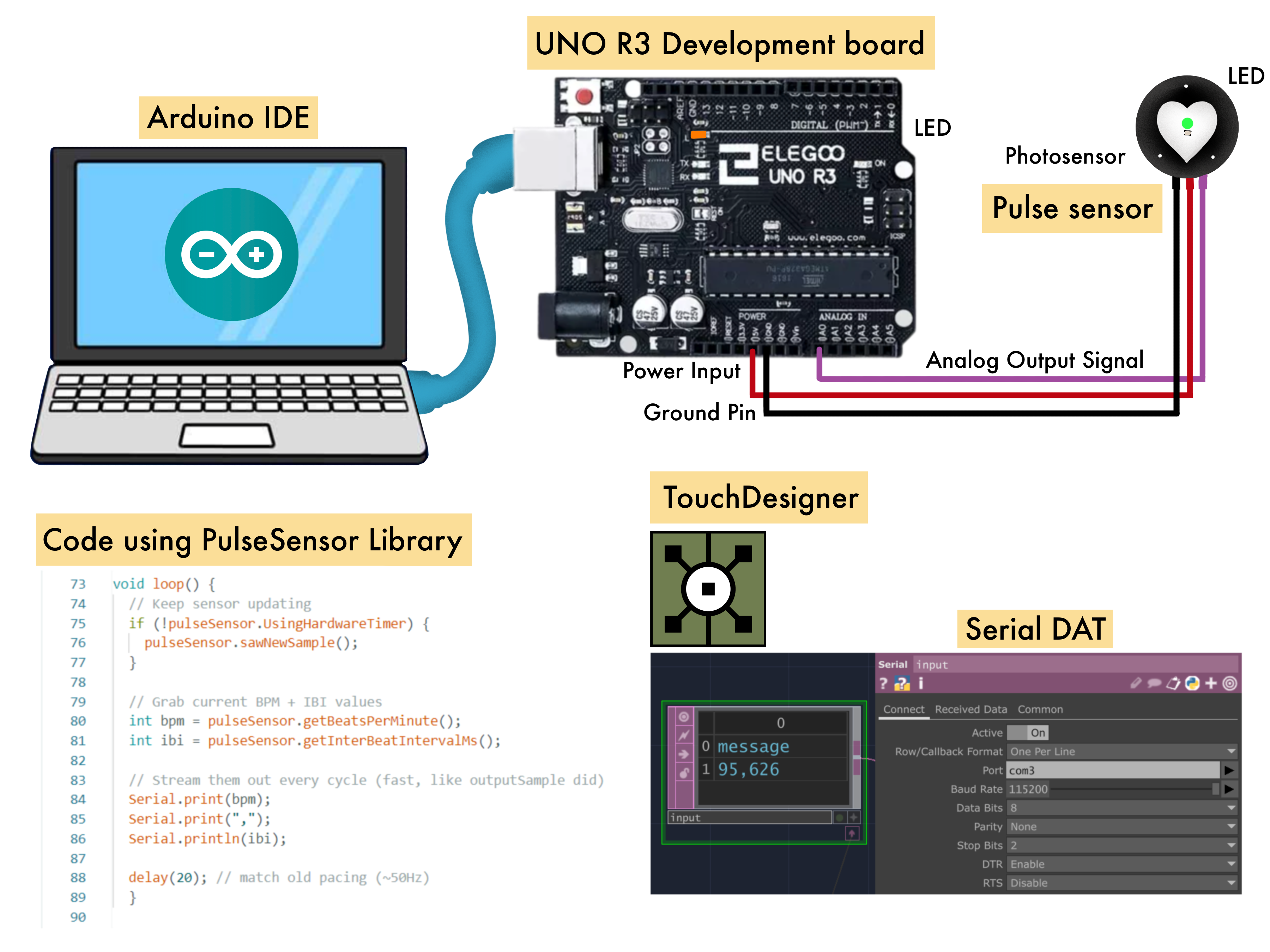 A pulse sensor connected through an Arduino reads the signal, processes BPM and IBI in Arduino IDE, and streams them to the computer. The values are sent over USB as simple data that TouchDesigner can use in real time.
