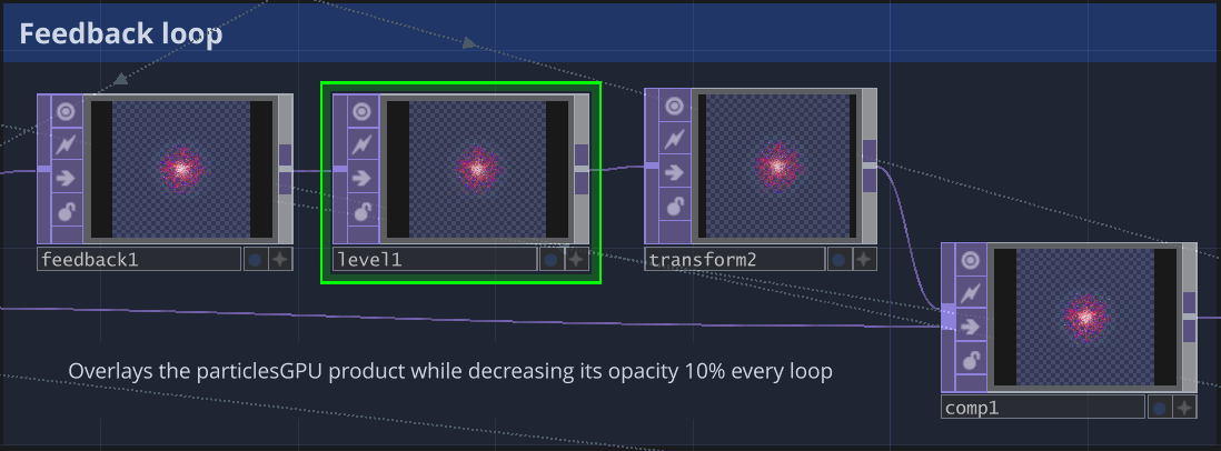 Initially, the particles generated by the Particle GPU appeared too flat, existing on a single visual layer. I wanted the structure to feel more three-dimensional and volumetric without losing the delicate branching form I had already built. Increasing the birth rate added density but didn't create the illusion of space I was aiming for. The solution was to introduce a feedback loop that layers each frame with slightly reduced opacity—about a 10% decrease per frame—creating subtle visual trails that accumulate over time. This approach gave the particles a soft, immersive depth effect while preserving the original geometry and overall flow of the system.