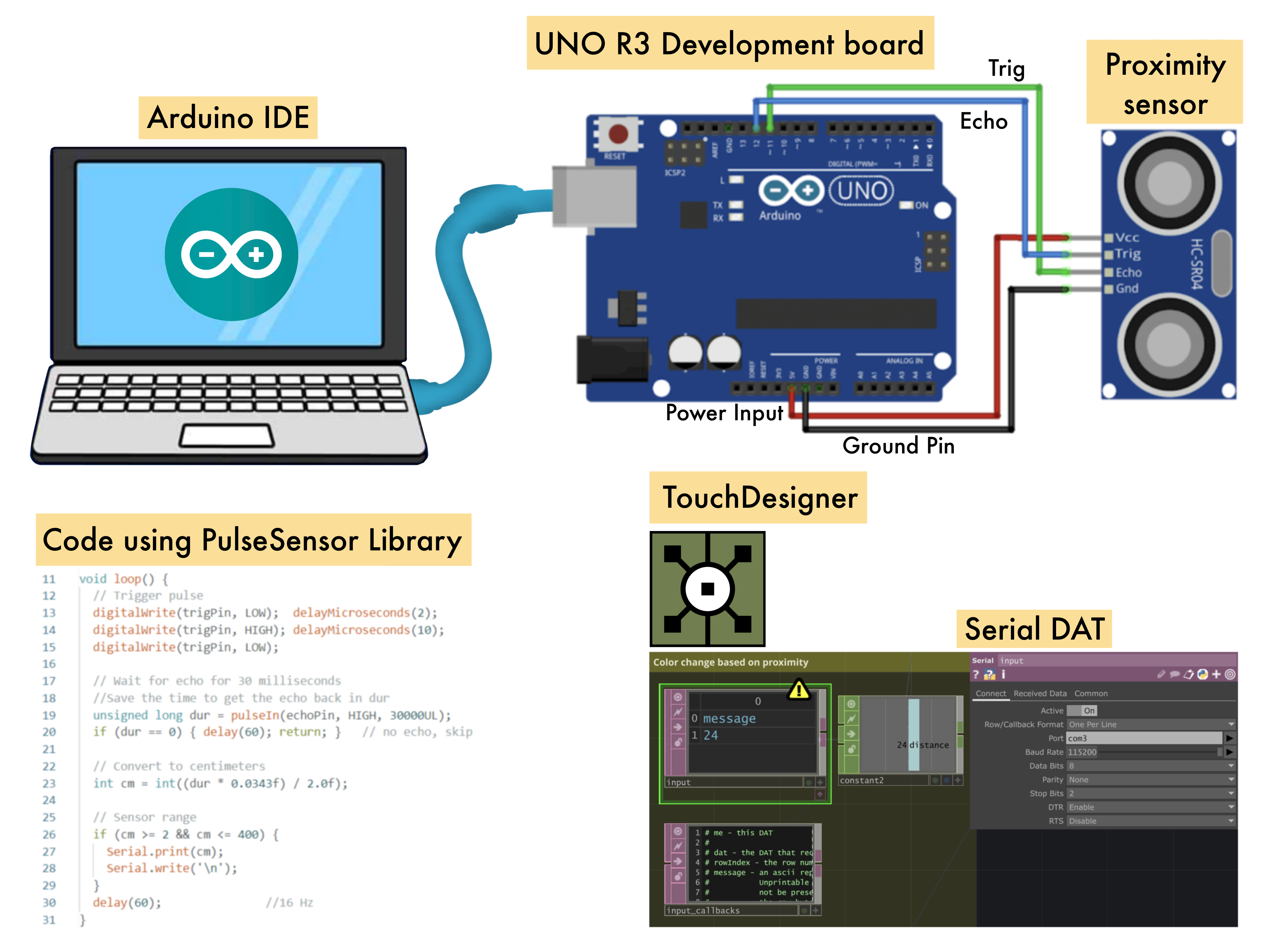 A proximity sensor connected through an Arduino reads the signal, processes distance in centimeters in Arduino IDE, and streams it to the computer. The values are sent over USB as simple data that TouchDesigner can use in real time.