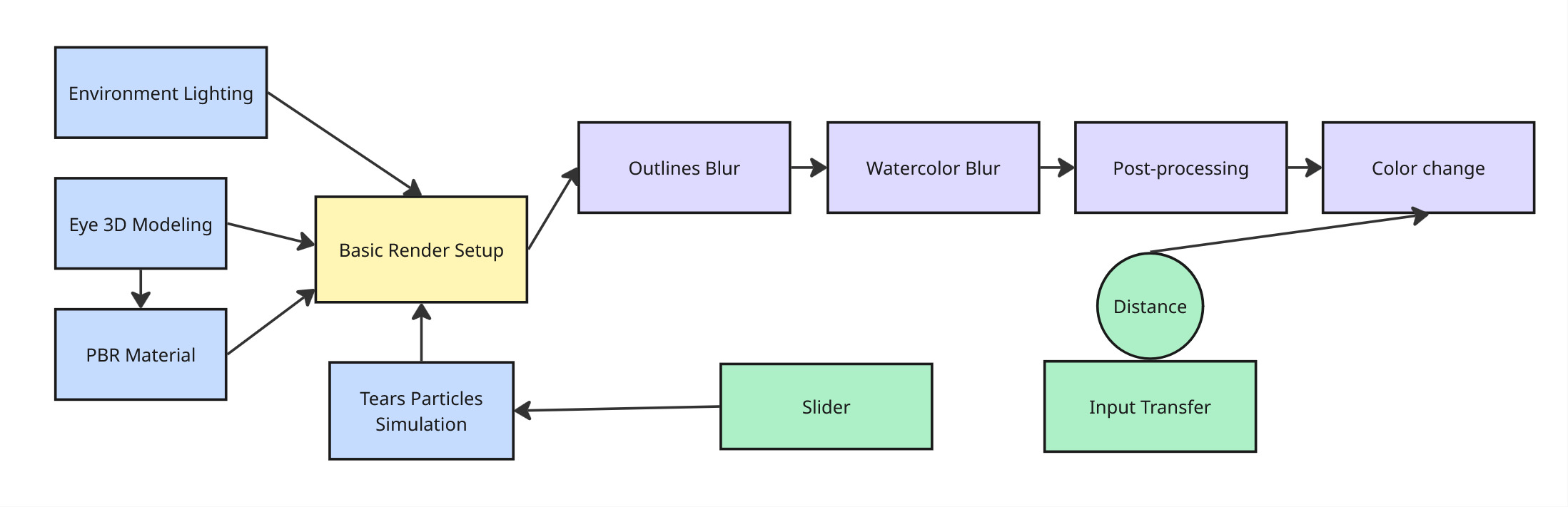 Tears: A particle simulation emits from a semicircular source precisely aligned with the eye pupil to simulate tears.