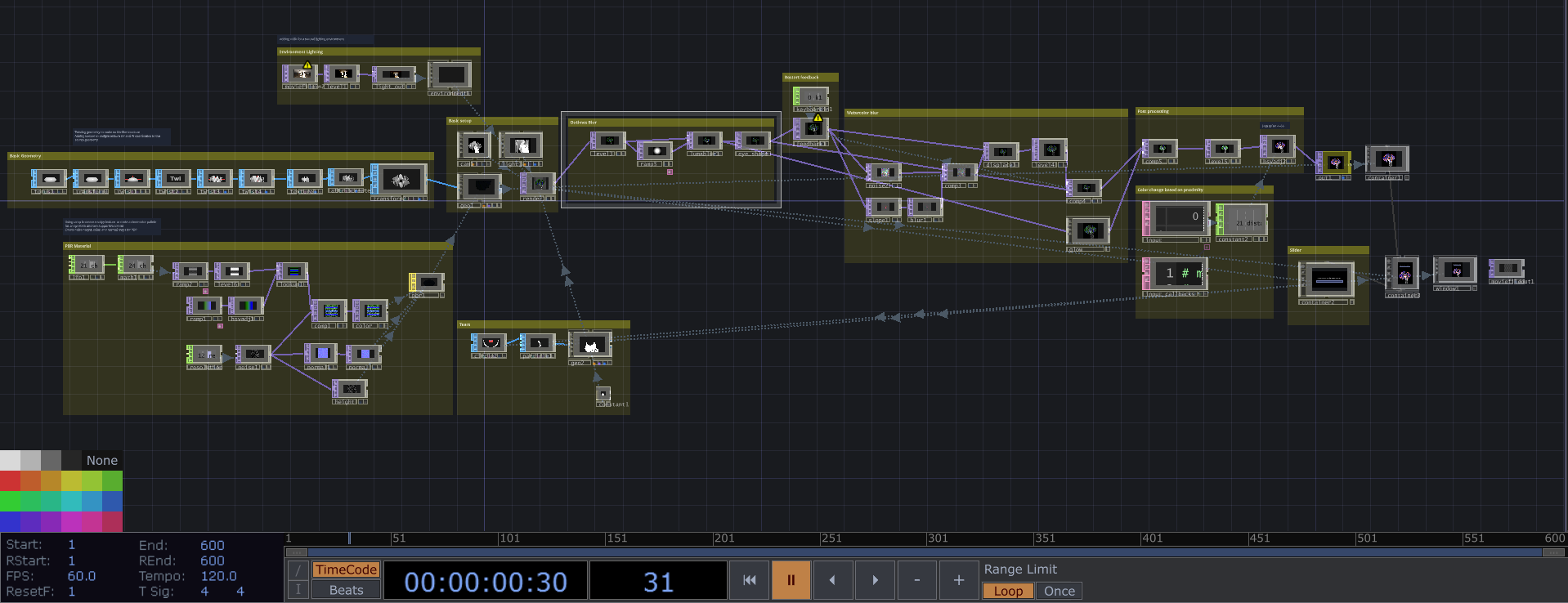 Eye: The base eye geometry is generated by twisting a torus. Its surface uses a PBR material enhanced with subtle, animated noise affecting the height, normal, and color maps. A ramp node produces a striped, three-color palette (black and two supporting hues) that shift dynamically.