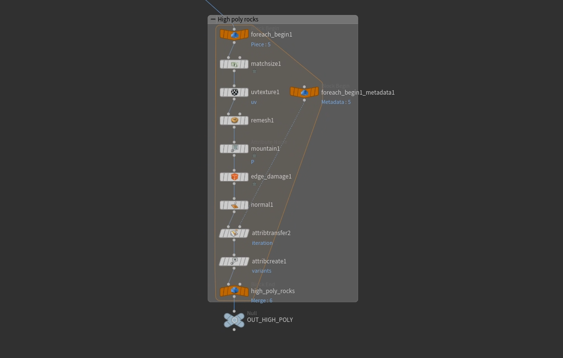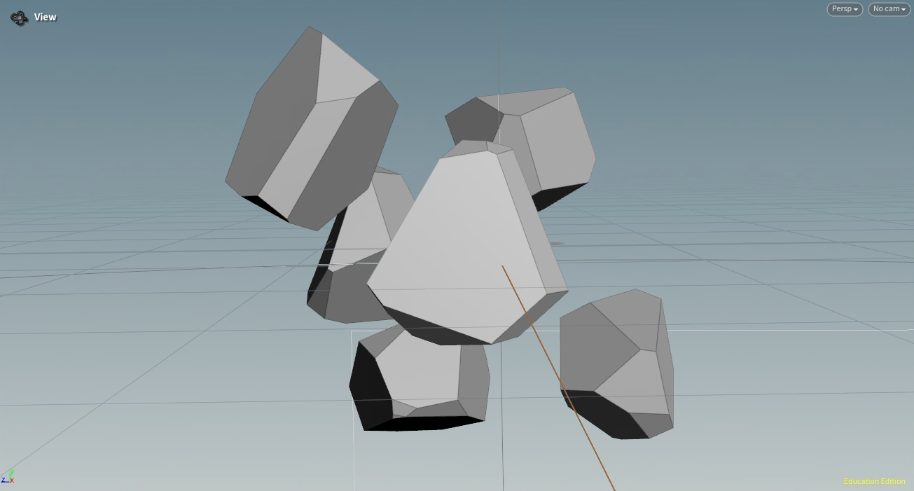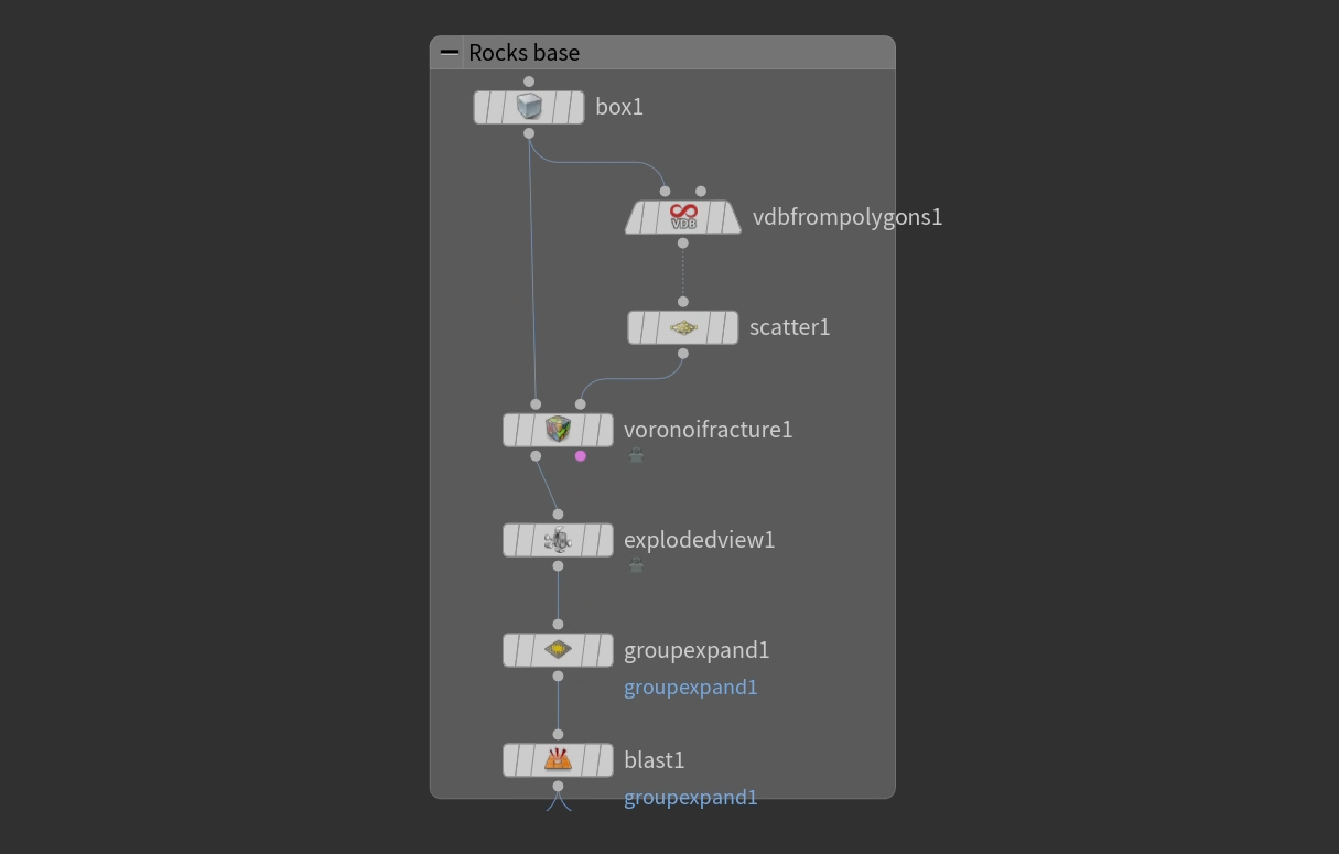 I made harsh rock shapes by fracturing the box and removing outer elements—this remained the low poly version that I used for faster simulation. Then I gave rocks more texture and irregularity on edges and surfaces and thus created a high poly version.