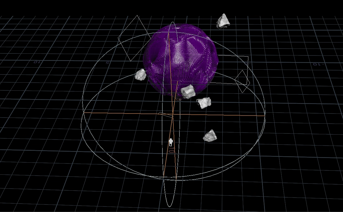 I placed the meteorites further from the planet's surface by altering their position vectors inside the PointVOP. Then I added perlin noise to their position attribute and animated it in the Attribute Noise Node.