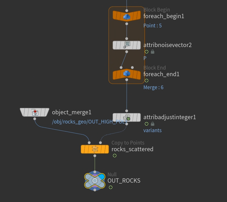 My solution was creating an attribute called 'variants' which had a unique value for each of the meteorite shapes based on forloop's iteration value. For each point—to which I later copied the meteorites geometry—I also created the 'variants' attribute through the Attribute Adjust Integer node. This attribute's values were random values from 0 to 5 (the number of different meteorite shapes I have). After bringing my meteorites geo to the planet geo stream through the Object Merge node, I set the Copy To Points node to use Piece Attribute and the meteorites with the variants value x was copied to the point with the same variants value.