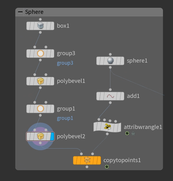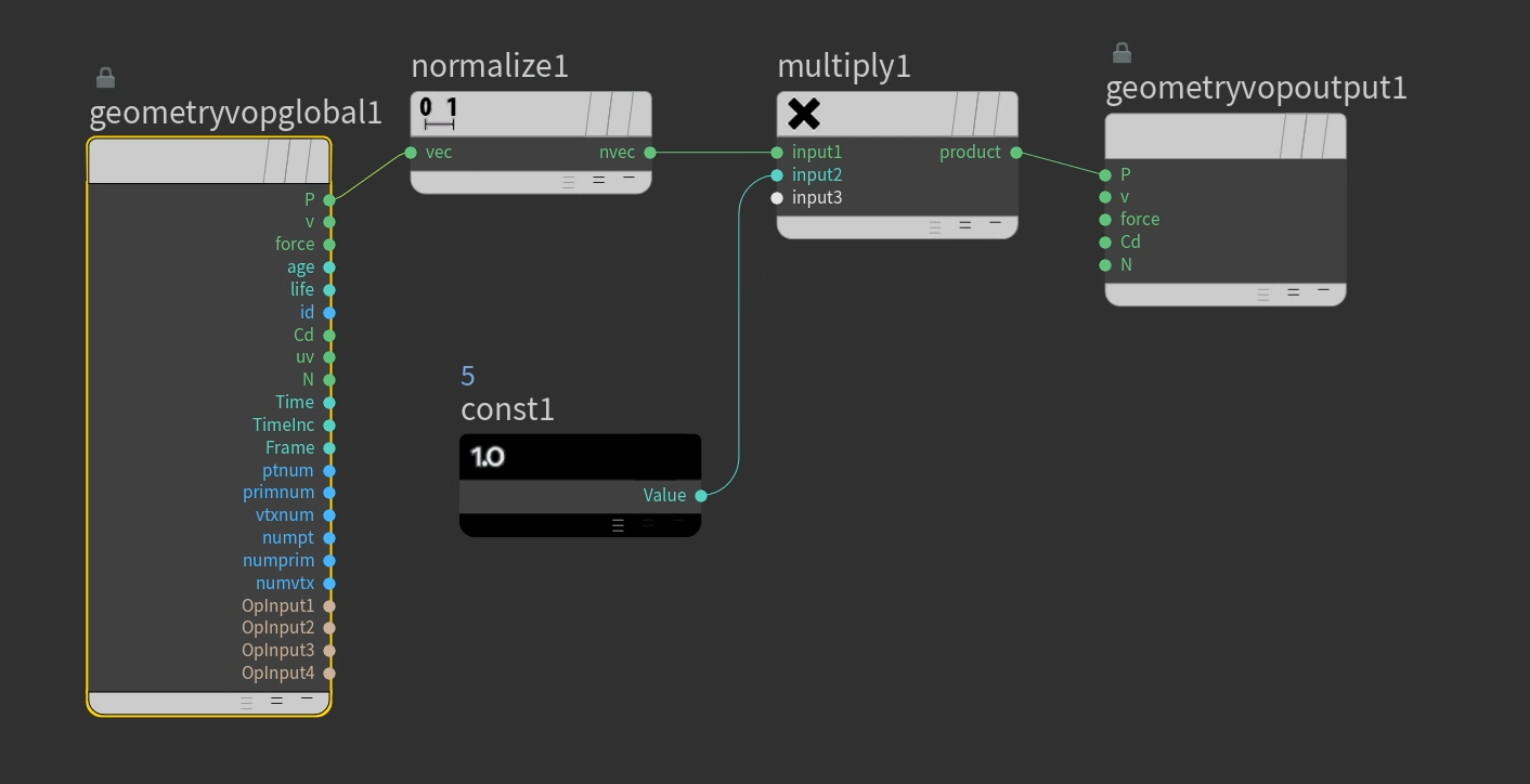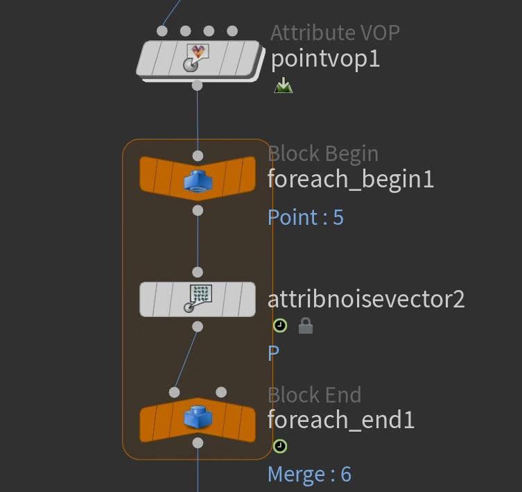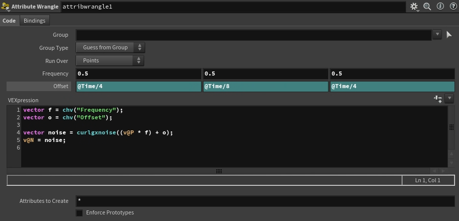 My VEX code utilizes the curlgnoise() function to alter the normals of the points—the bases for metallic petals—every frame. The speed of the behaviour is defined by expressions based on the time attribute.