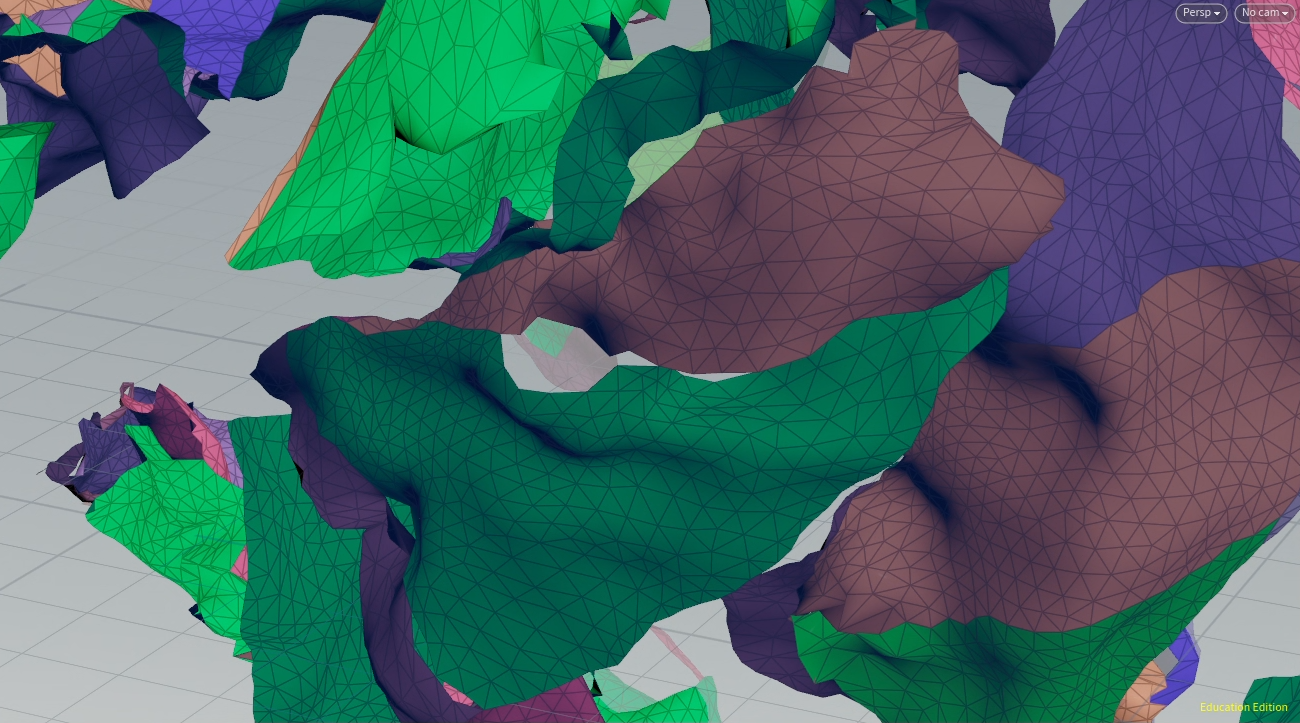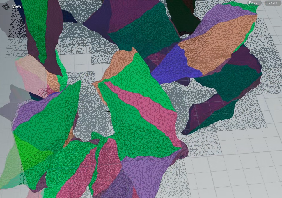 The vellum pieces start with a simple 60x30 grid as the base geometry. I remeshed the grid geometry to create a solid foundation for further transformations using a for-loop to give the cloth a more natural look, especially around the torn edges and disconnected pieces. Each cloth element's position was altered with noise, and I distorted the edges and randomly rotated each piece, adding randomness to the design and enhancing its organic appearance.