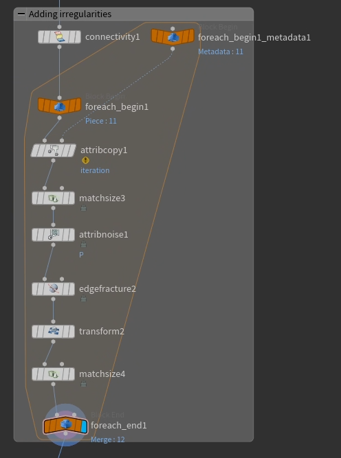 Initially, since all the cloth pieces were identical, applying noise and fracture produced the same result for every piece. To solve this, I utilized the "iteration" attribute generated by the for-loop, which is unique for each piece. By setting the offset for noise through the equation rand(detail(0, "iteration", 0)), I generated a pseudorandom value based on the iteration attribute. Similarly, for the Edge Fracture node, I defined the number of pieces the cloth fractured into based on detail(0, "iteration", 0)/5, which created a value from 0 to 5 depending on the iteration. This approach allowed each piece to have unique transformations, making the final result more varied and realistic.