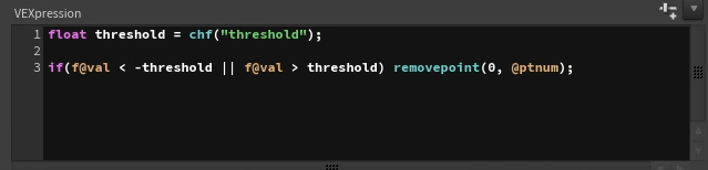 In the second part of the code, I used a threshold value to isolate the points where the normal is nearly perpendicular to the camera. Points where the val attribute was too far from zero were filtered out, either by removing values below the negative threshold or above the positive threshold. This left only the points where the normal was almost perpendicular to the camera, typically outlining concavities in the cloth.