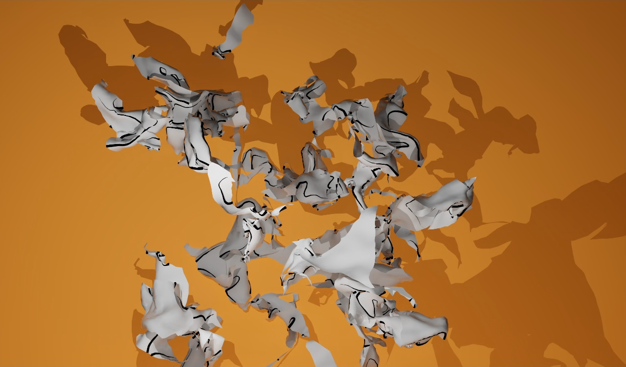 For rendering, I created three custom materials: one for the cloth, one for the lines on the cloth, and one for the background. I designed the background to contain shadows from the flying cloth pieces, so I created a highly diffusive orange material. To ensure no reflections from the lighting, I set the roughness of the reflection to 0, keeping it matte. For the black lines outlining the cloth, I rendered them as strands and adjusted their scale and type to achieve the desired visual effect.